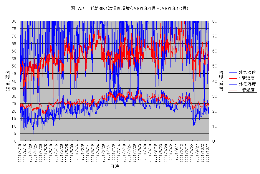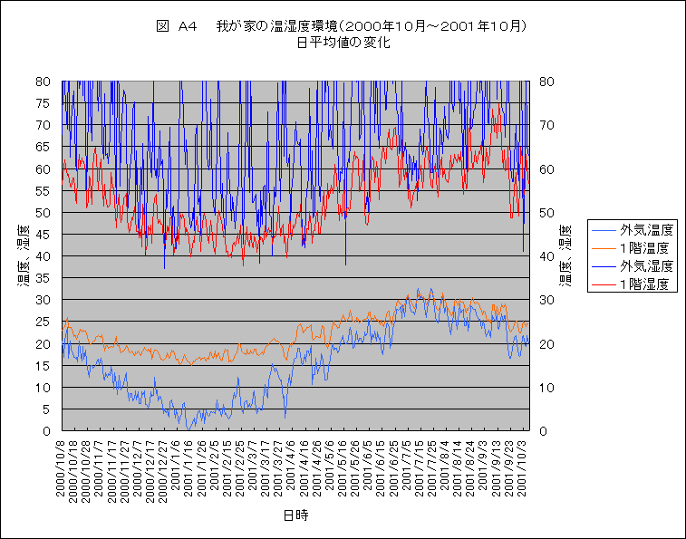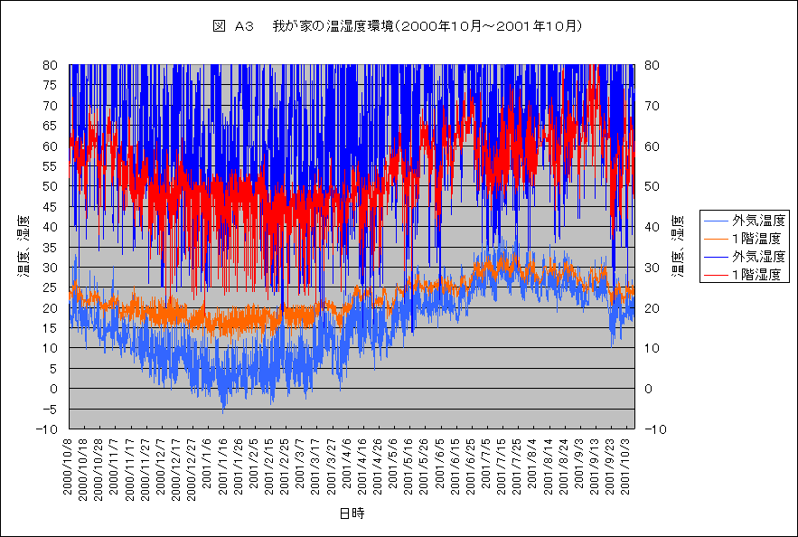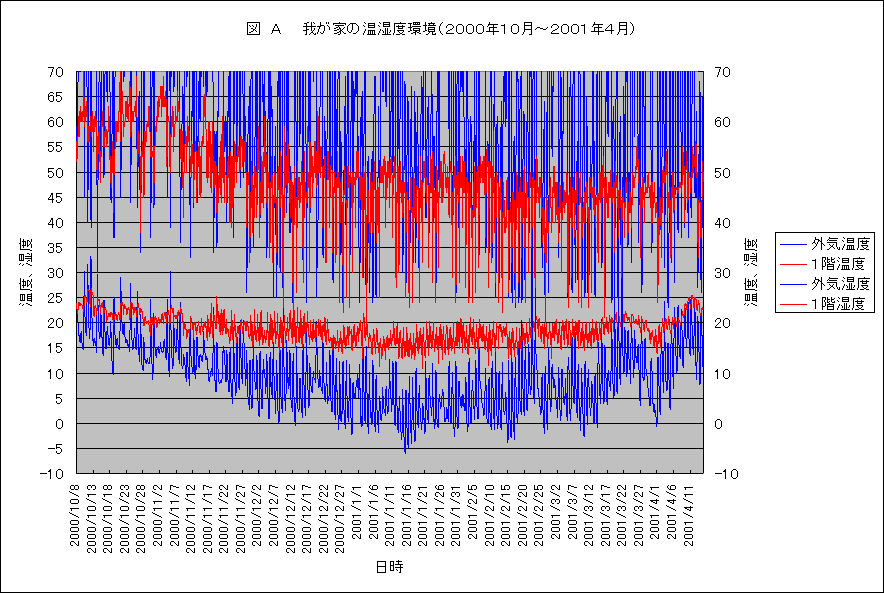 ・1年の温度湿度 去年の10月から我が家の温湿度を測定しだして早1年がたちました。全部で、5台の温湿度計を1階、2階、屋外その他のところに設置して、様子を見てきました。 沢山のことを整理しなくてはいけないのですが、今のところ手が回りません。これまでに、冬の様子は少しずつこのコーナーで紹介してきましたが、夏の分は全く手つかずです。何もないと、何も判らないので、とりあえず、1年間の結果だけを紹介しておきます。沢山のデータがとれていますので、紹介するのはほんの一部です。 紹介するグラフは、以下の4つです。何れも1階と屋外の温度と湿度の記録データーです。これで、冬の様子、夏の様子がわかるでしょうか。今少しずつ、考え中ですが、いろいろなことが判ってきました。なかなか整理して紹介する時間がないので、ただ、データをご覧ください。そしてどんなことが言えるのか、よろしければ、考えてみてください。ご意見、ご質問、ど〜ぞ、お願いいたします。 図A ・・・ これは、冬の温度と湿度です。1時間おきのデーターですので細かく振れてしまいます